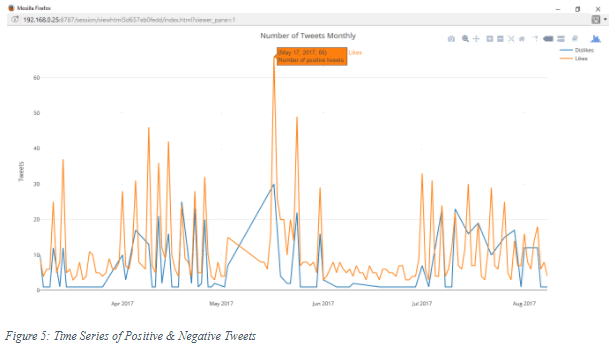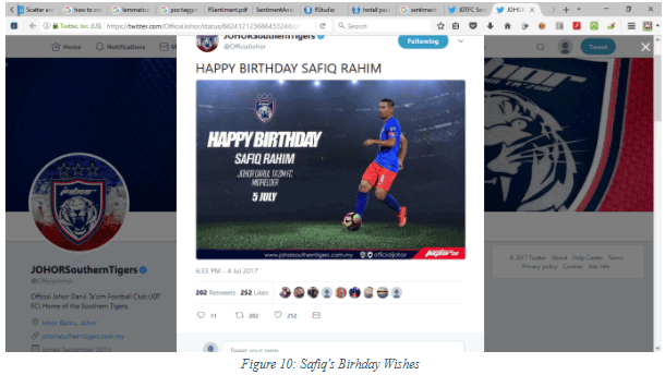 The orange line indicates how many positive tweets over the course of several months up until August 2017. The blue line indicates negative comments. The peaks on both lines corresponded very well with dates when matches took place, an indication that most likely a match involving JDT will trigger a heightened interest to tweet. You may argue that the number of tweets may be contributed by followers who actually do not like JDT. Our argument is that if they don’t like JDT why then, would they follow the channel. The negative feedbacks was due to sentiments such as missed opportunities, disagreeing with the referee and so forth. You can hover your mouse to each of the peaks to see the exact date they represent.