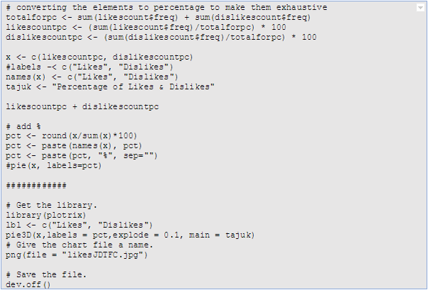 Now let’s take a peek at a pretty generic display of likes and dislikes – pie chart. In order to achieve this, we concocted this R script which we share in the box below: