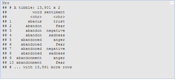 For example, consider the NRC Word-Emotion Association lexicon, available from the tidytext package, which associates words with 10 sentiments: positive, negative, anger, anticipation, disgust, fear, joy, sadness, surprise, and trust.
