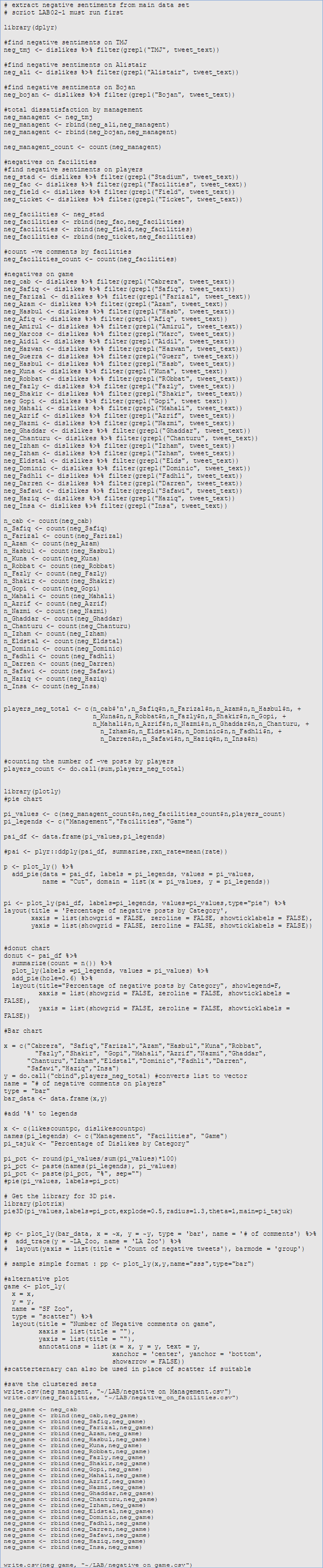Let’s move on to investigate further on the negative posts. We now extract ONLY the negative tweets of about 23% of the whole posts. We further classify them based on Naïve Bayes classifier to three distinct posts namely, management, facilities and the game itself. We group them further together into the three entities we mentioned. This is called agglomerative clustering where it involves clustering of an existing cluster. Agglomerative clustering also involves a structure or hierarchy, in this case, sentiment, then the three entities. Games would most usually mention players who are also entities but we group them together with game for our analysis.