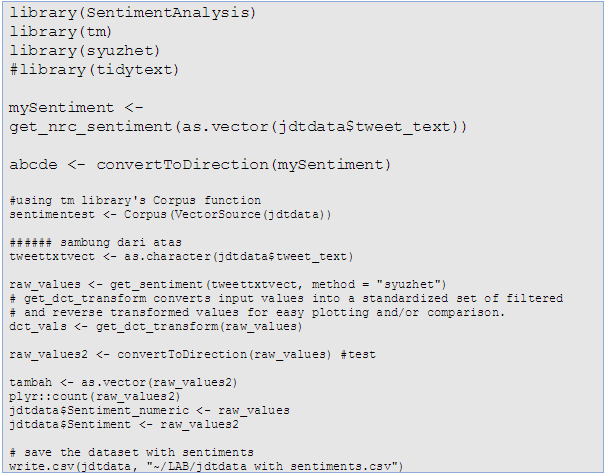 Hence, more work is still needed to be able to comfortably perform sentiment analysis for Malay language text. We employed various dictionaries including syuzhet, Harvard IV, bing, afinn, nrc and several others, all of which caters only for English.