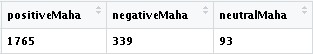 countlikesMaha <- paste(likesMaha$`convertToDirection(sentiment$SentimentQDAP)`,collapse="") positiveMaha <- str_count(countlikesMaha,"positive") negativeMaha <- str_count(countlikesMaha,"negative") neutralMaha <- str_count(countlikesMaha,"neutral") sentMaha <- data.frame(positiveMaha,negativeMaha,neutralMaha) View(sentMaha)