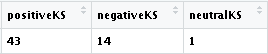 #Doing the same for LKS doc <- sapply(KSLessMahathir$para, function(row) iconv(row,"latin1","ASCII",sub="")) sentiment <- analyzeSentiment(doc) # View sentiment direction (i.e. positive, neutral and negative) convertToDirection(sentiment$SentimentQDAP) likesKS <- as.data.frame(convertToDirection(sentiment$SentimentQDAP)) countlikesKS <- paste(likesKS$`convertToDirection(sentiment$SentimentQDAP)`,collapse="") positiveKS <- str_count(countlikesKS,"positive") negativeKS <- str_count(countlikesKS,"negative") neutralKS <- str_count(countlikesKS,"neutral") sentKS <- data.frame(positiveKS,negativeKS,neutralKS)